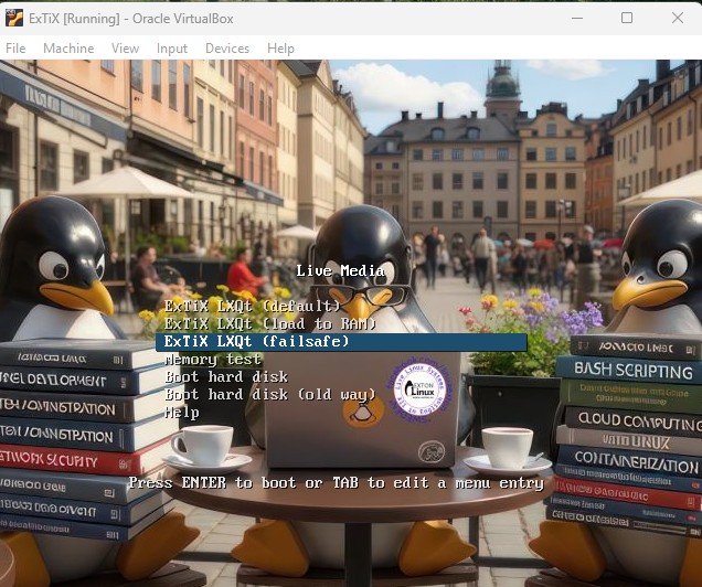 ExTiX LXQt 25.12 runs very well live in VirtualBox and VMware. You may have to start ExTiX in failsafe mode – screenshot. That can be the case even after a virtual hard drive installation – see this boot menu…