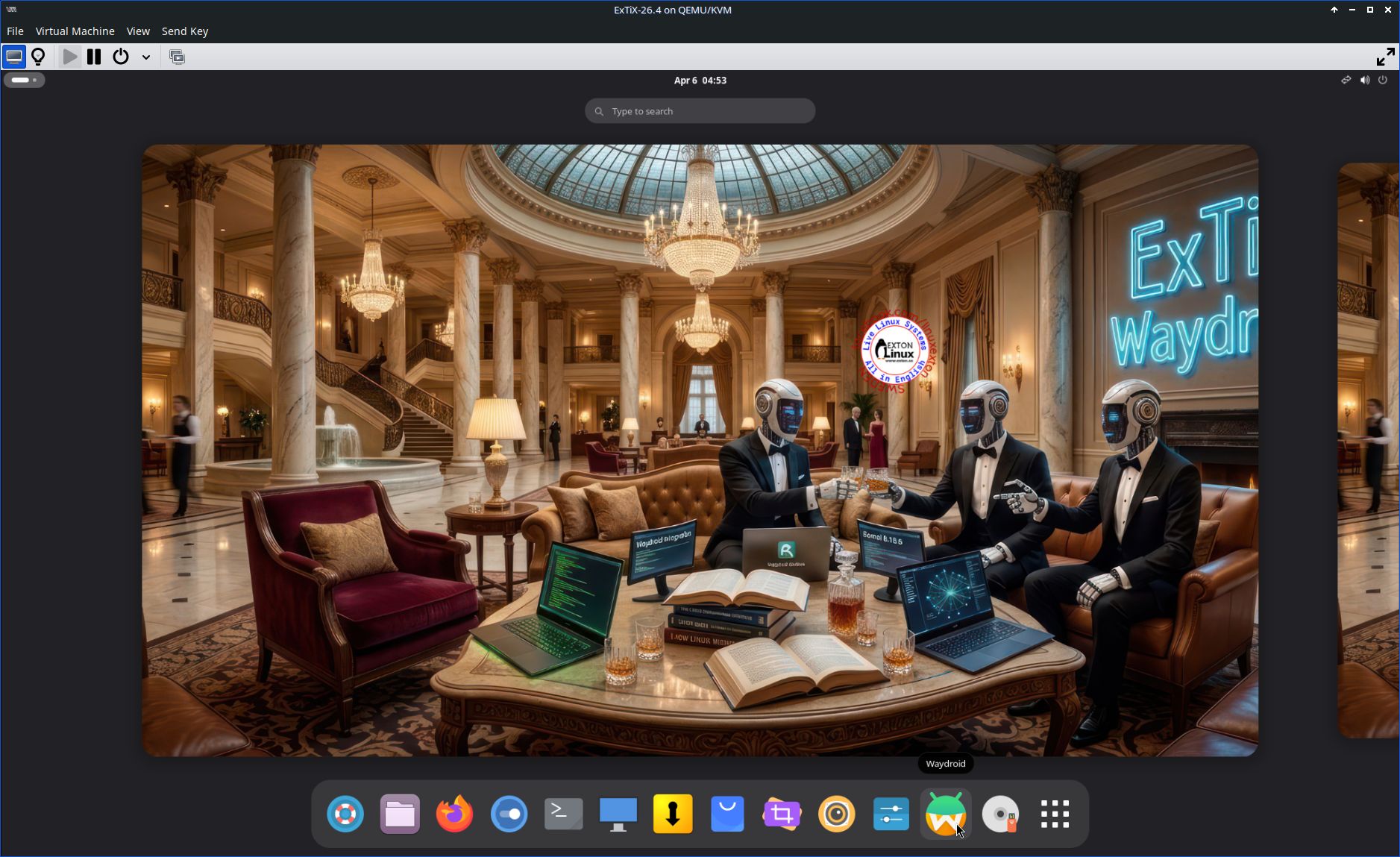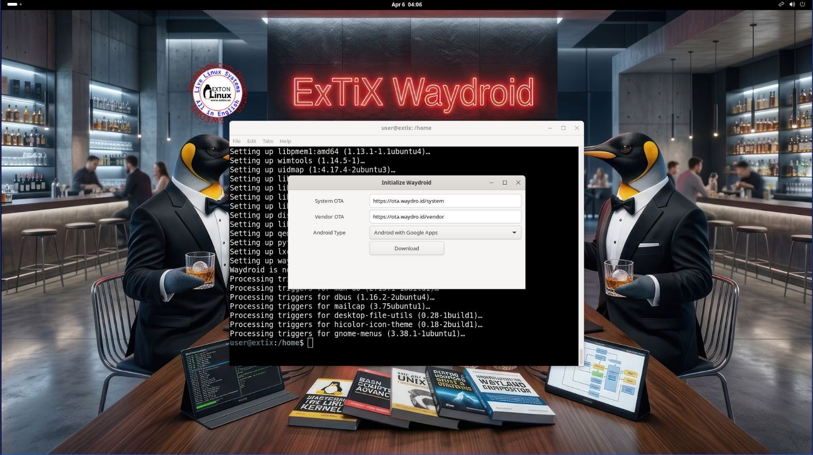 5. After a hard drive installation of ExTiX you can initialize and run Waydroid. After installing GAPPS you can use Google Play for installing new Android apps. NOTE: Not ALL apps will run using Waydroid.